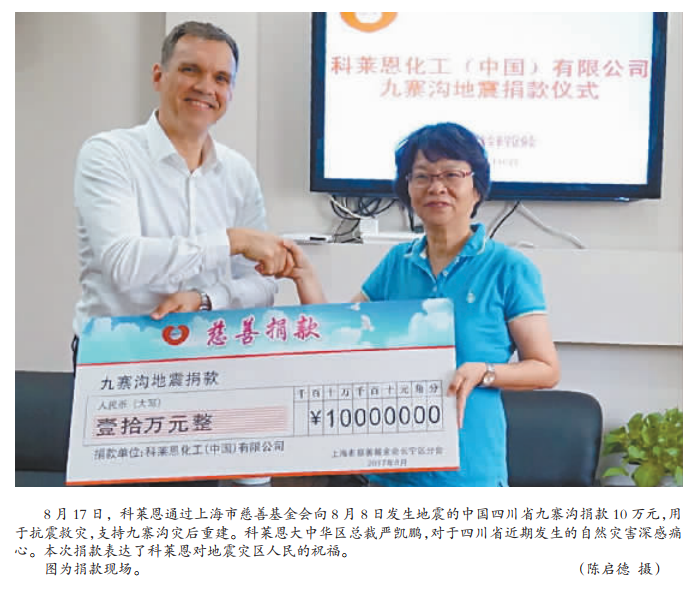 科莱恩向震后四川捐献人民币10…