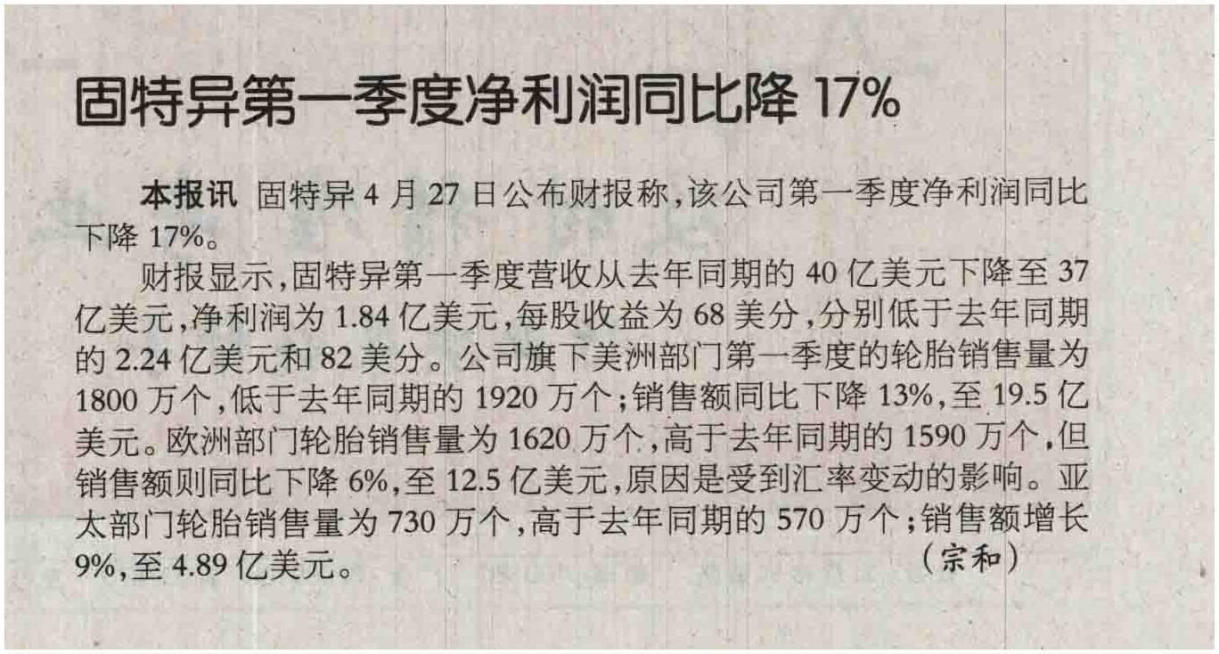 Comments on 20160505 中国化工报 固特异第一季度净利润同比降17%