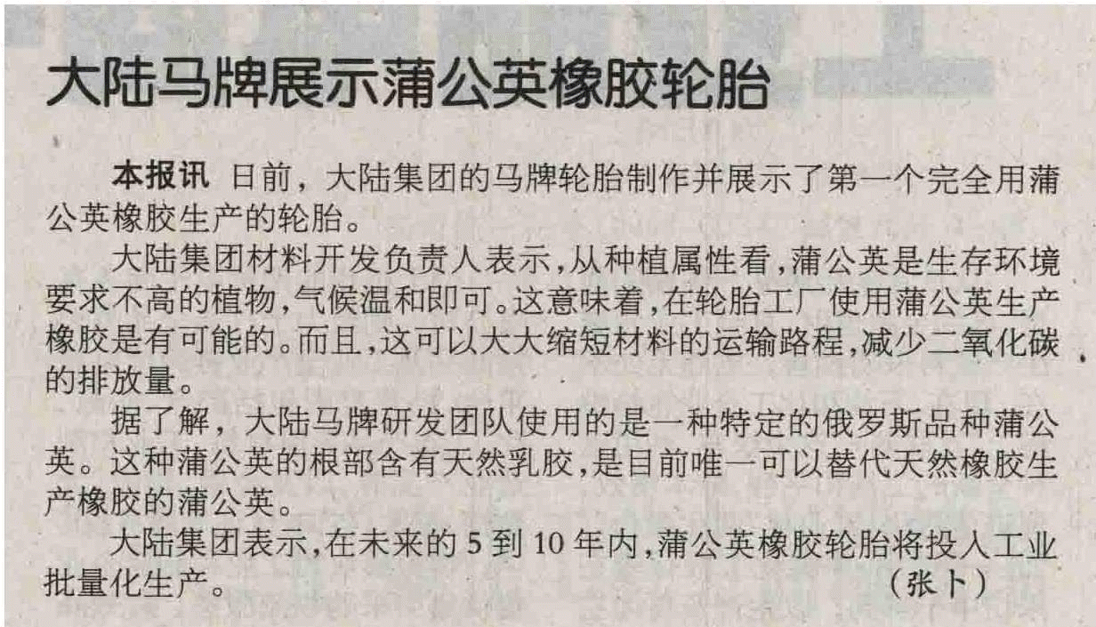 Comments on 20160512 China Chemical Industry News 大陆马牌展示蒲公英橡胶轮胎