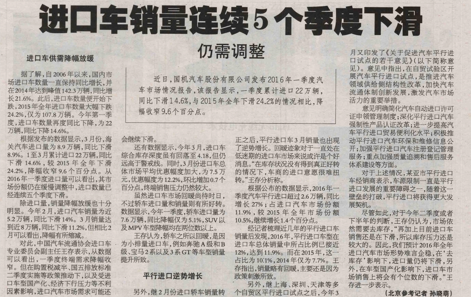 20160516 Beijing Reference News 15 进口车销量连续5个季度下滑