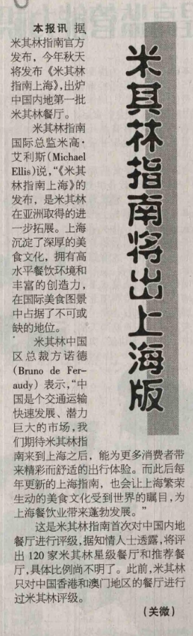 20160526 China Food News 米其林指南将出上海版