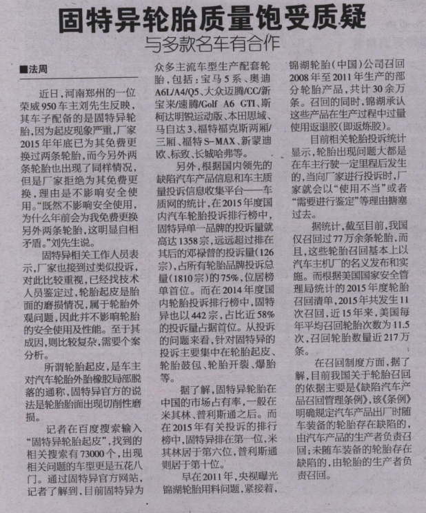 20160526 FZ Evening News 固特异轮胎质量饱受质疑 与多款名车有合作