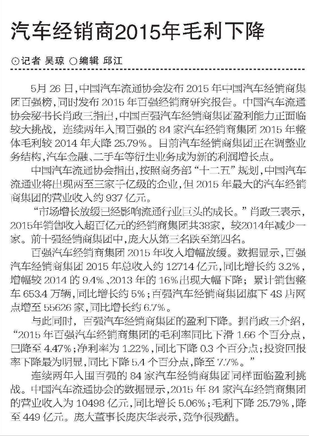 Comments on 20160527 Shanghai Securities 汽车经销商