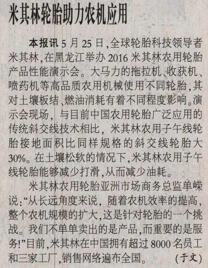 Comments on 20160602 Workers'Daily 米其林轮胎助力农机应用