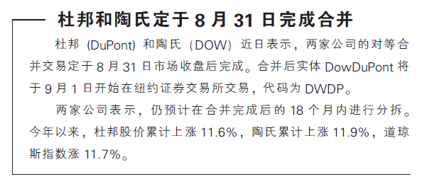 杜邦和陶氏定于8月31日完成合…