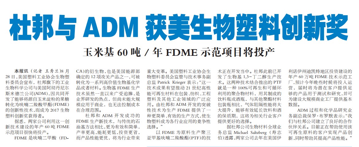 杜邦与ADM获美生物塑料创新奖
