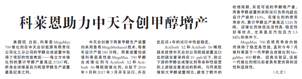 科莱恩助力中天合创甲醇增产