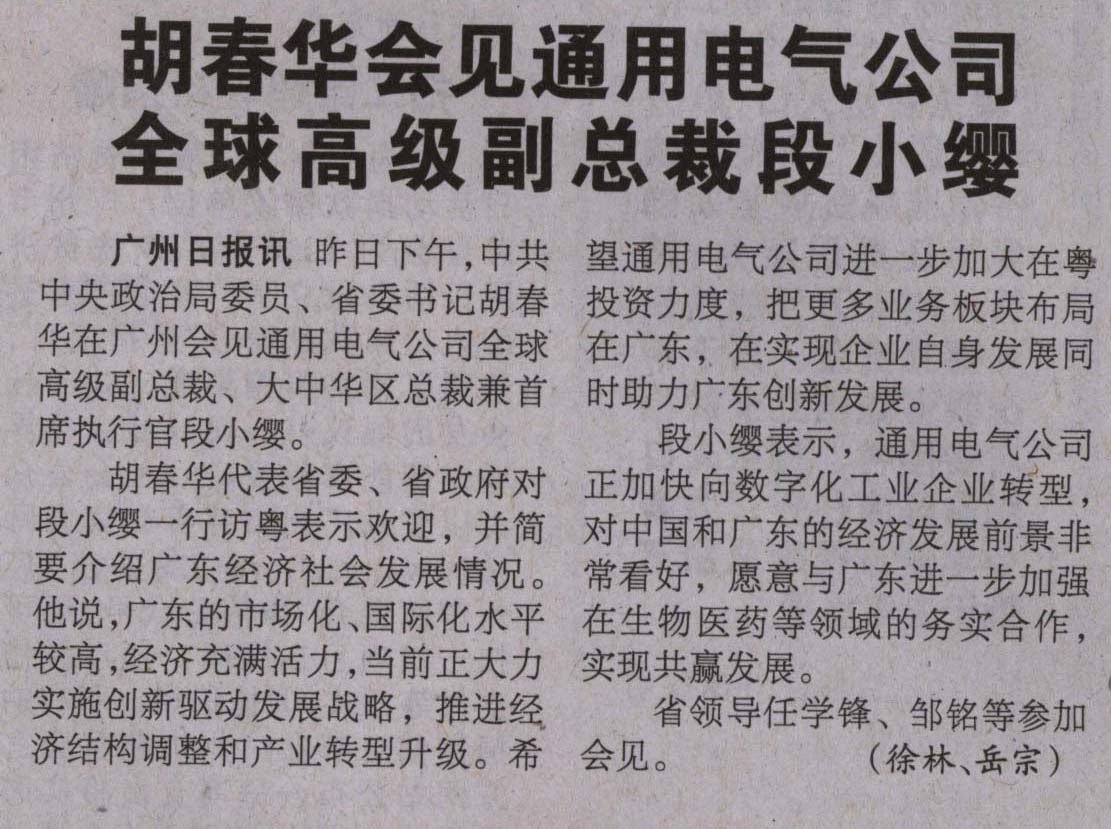 Comments on 胡春华会见通用电气公司 全球高级副总裁段小缨