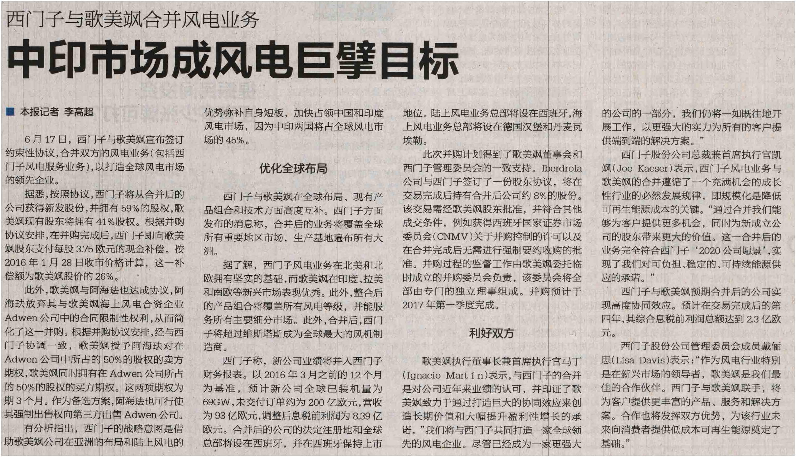 西门子与歌美飒合并风电业务 中印市场成风电巨璧目标