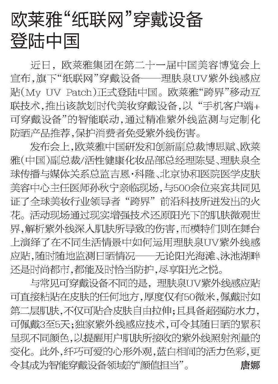 欧莱雅“纸联网”穿戴设备登陆中国