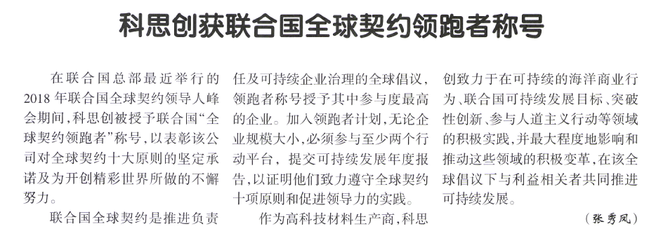 科思创获联合国全球契约领跑者称号