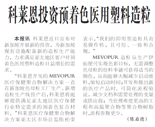 科莱恩投资预着色医用塑料造粒