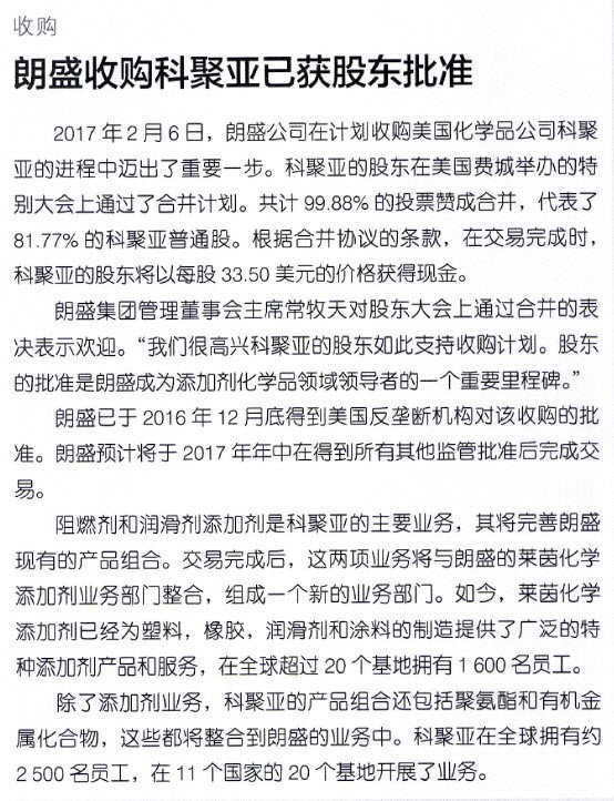 朗盛收购科聚亚已获股东批准