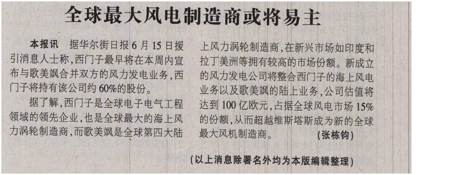 全球最大风电制造商或将易主