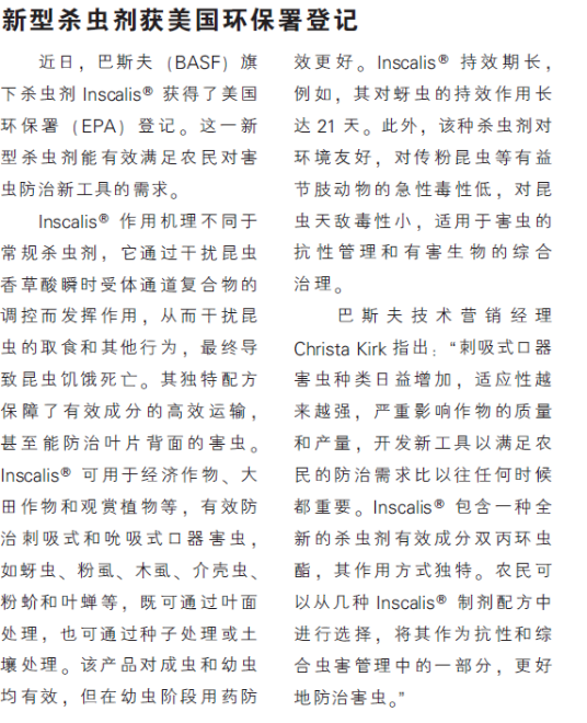 新型杀虫剂获美国环保署登记
