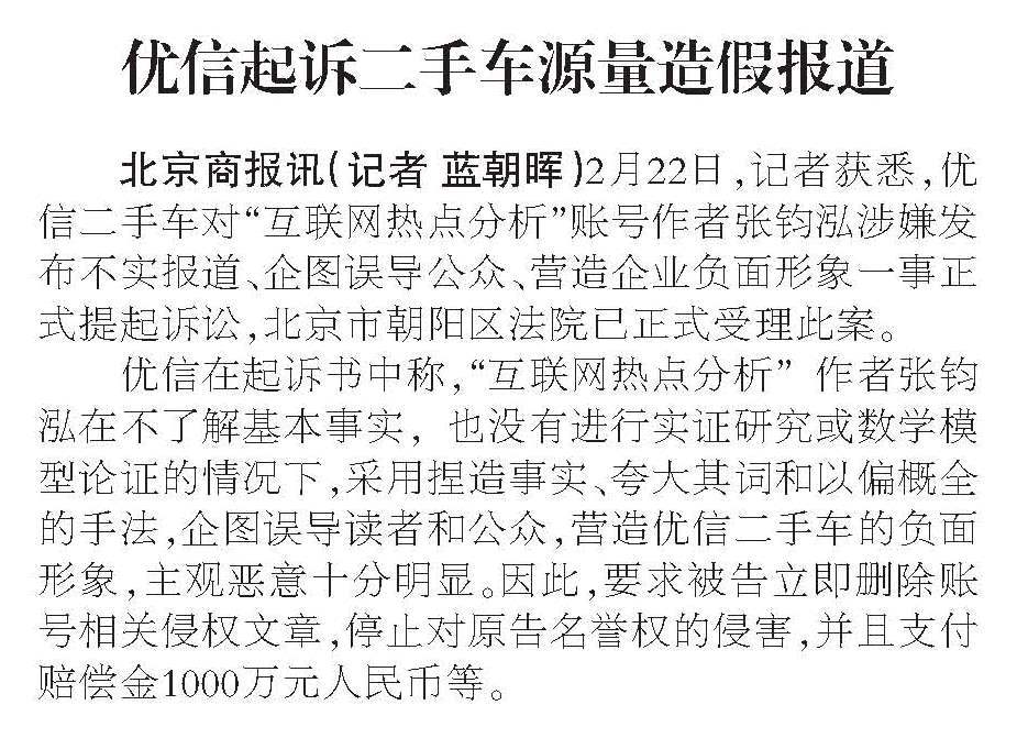 优信起诉二手车源量造假报道