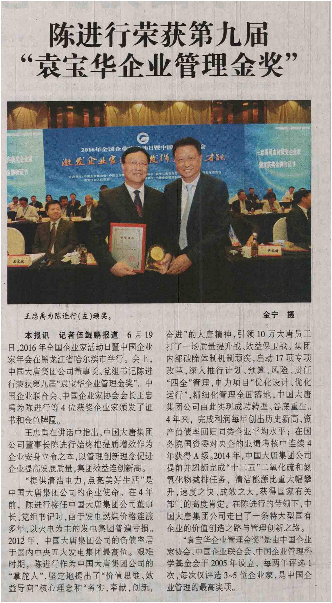 陈进行荣获第九届“袁宝华企业管理金奖”