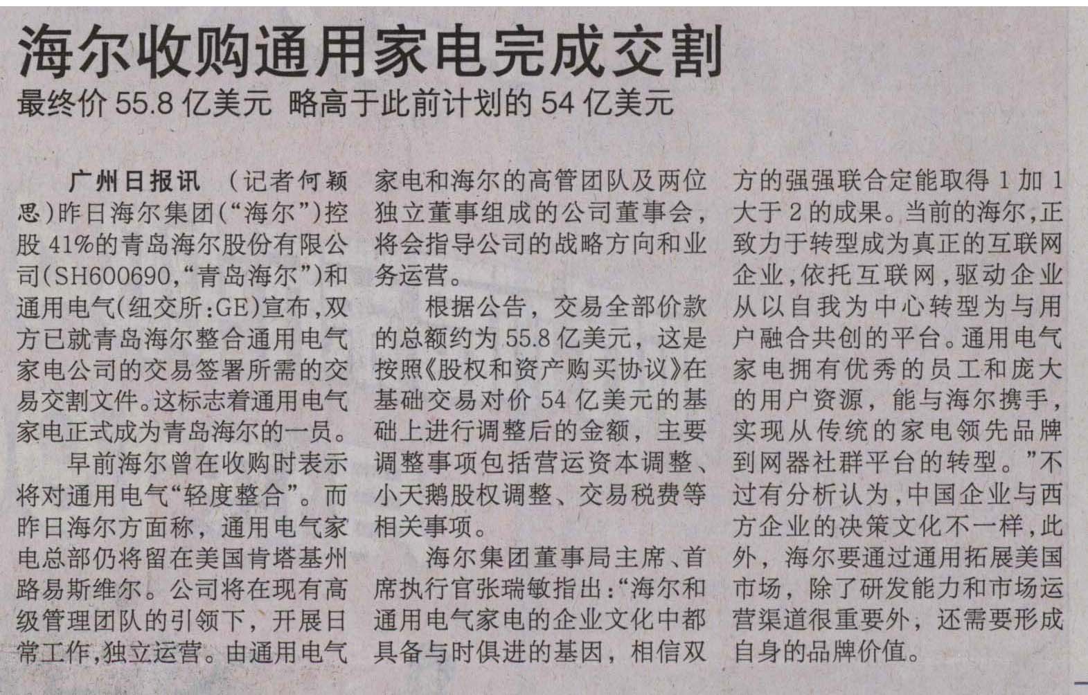 Comments on 海尔收购通用家电完成交割