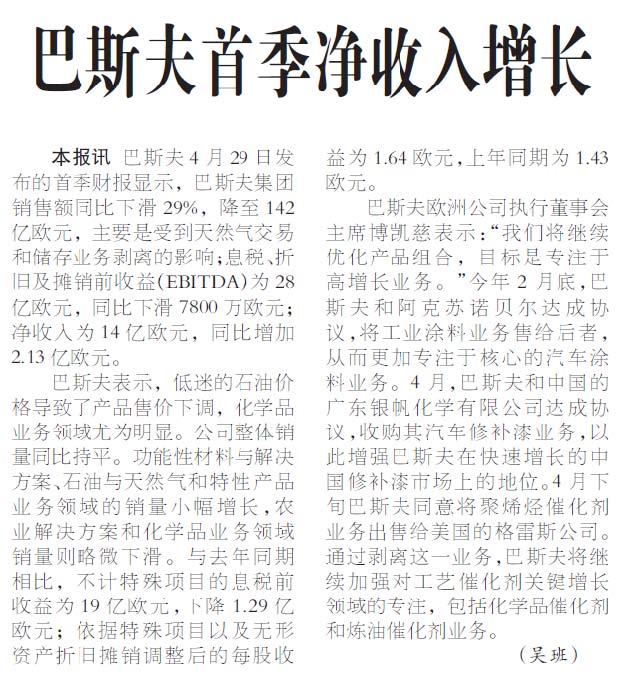 Comments on 巴斯夫首季净收入增长