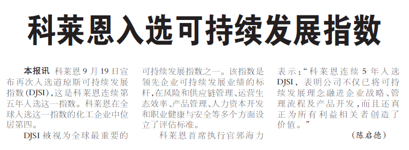 科莱恩入选可持续发展指数